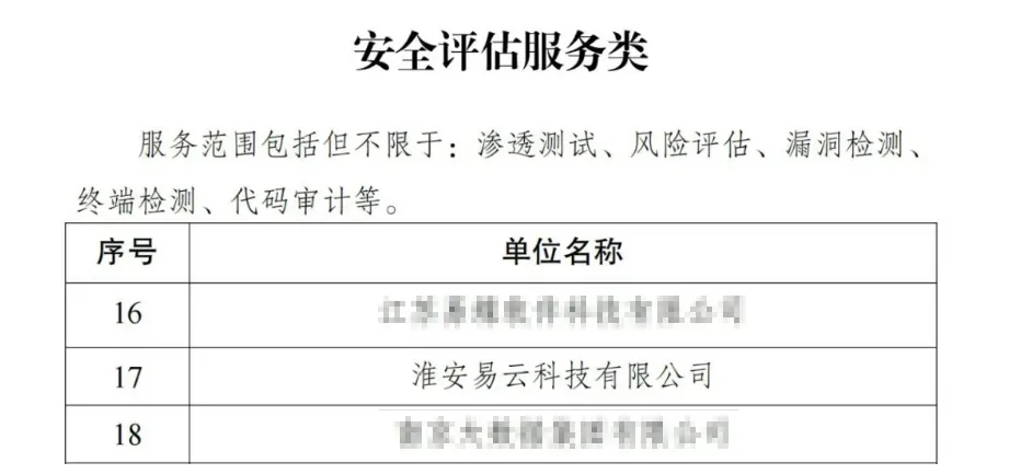 7月15日,省委网信办发布“2024年度江苏省网络安全服务资源池入池单位名单”。淮安易云科技有限公司成功入选安全评估服务类、应急处置服务类和网络安全持续改进服务类服务机构。