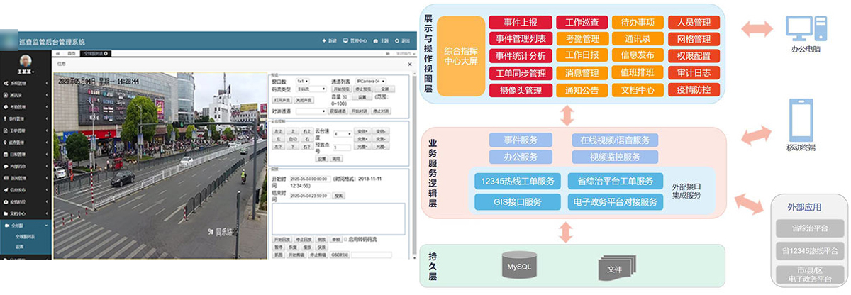 系统使用Java EE技术体系开发,提供了电脑端和移动终端,辅助管理机构便捷快速地感知与协调处理事件,远程巡查与指挥,在宏观层面掌控全局城镇治理情况,在微观层面跟进了解事务细节;系统还融合了办公系统服务等功能。